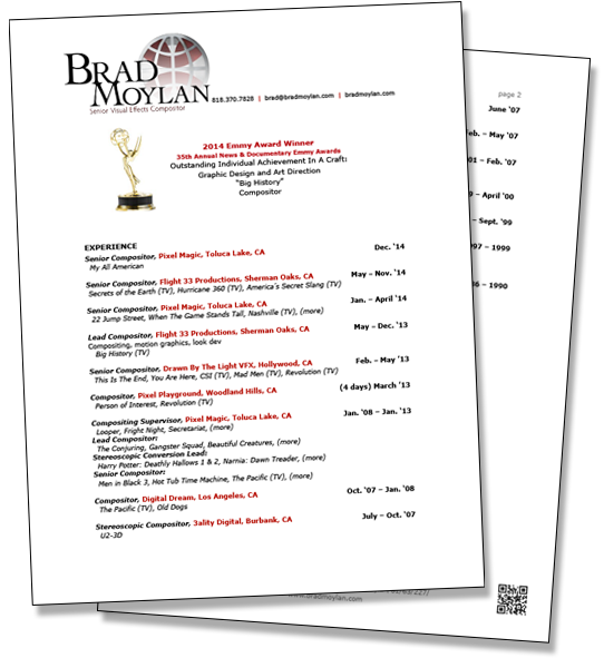 I am an Emmy award winning compositor (2014 Emmy Award for Outstanding Individual Achievement In A Craft: Graphic Design and Art Direction, as a Compositor for "Big History" on H2) with more than 30 years (yikes!) experience in feature and television post-production. I am a senior level compositor, often serving as Lead or Supervisor. I am a co-founder of VFX Legion. Recent jobs include acting as Compositing Supervisor for "Winning Time" (Season 2) at Pixel Magic, as Compositing Supervisor for "Kinda Pregnant" (Netflix) for Optical Illusions VFX and as an in-house compositor for Tom Segura's sketch comedy show "Bad Thoughts" (Netflix).